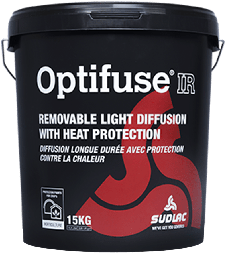 Optifuse® IR è un rivestimento rimovibile per serre che assicura un grado elevato di diffusione della luce, garantendo nel contempo un’efficace protezione termica. Optifuse IR è molto resistente all’usura e può essere applicato sulla parte esterna di tutti i materiali standard di copertura delle serre. Optifuse IR può essere facilmente rimosso con Topclear a fine stagione. Optifuse IR garantisce un altissimo livello di diffusione e un’elevata trasmissione della luce , il tutto associato ad un’efficace riduzione della temperatura. Questa combinazione intensifica la fotosintesi e riduce la temperatura all’interno della serra. Lo strato di rivestimento traslucido disperde la luce entrante che raggiunge le foglie da tutte le angolazioni, dalla base all’apice delle colture. Questo migliora la fotosintesi e la traspirazione di tutte le foglie delle piante, ottimizzando i livelli di umidità, temperatura e CO2 all’interno della serra. Gli studi hanno dimostrato che la luce diffusa, associata alla riduzione del calore, ha effetti benefici sulla produzione, sulla qualità e sulla crescita delle colture. Rispetto a Optifuse, la versione Optifuse IR riflette molto efficacemente le radiazioni termiche (NIR), preservando nel contempo la trasmissione del PAR. Modalità d'impiego: 17 secchi/ettaro per una diffusione luminosa del 85%; 22 secchi/ettaro per una diffusione luminosa del 90%.